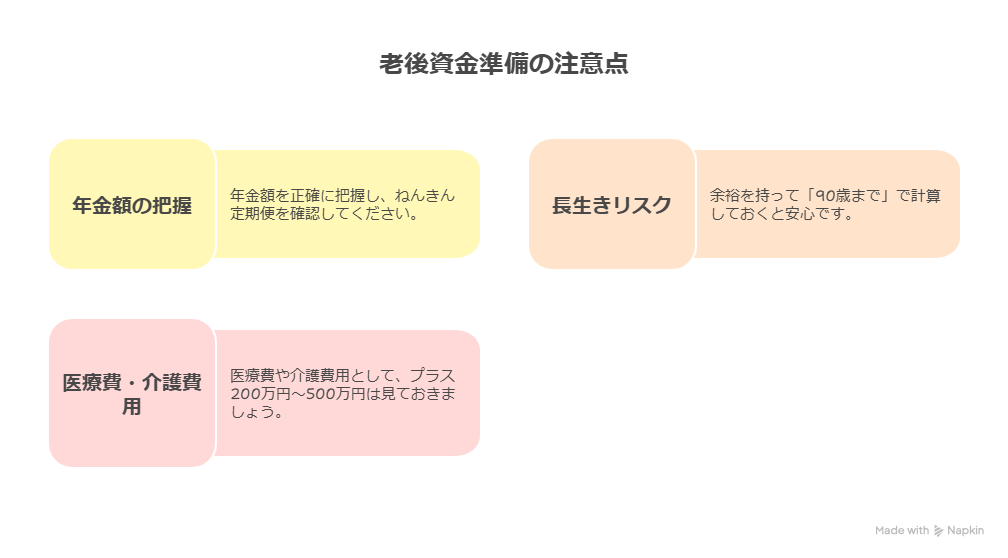 医療費・介護費用として、プラス200万円〜500万円は見ておきましょう。これがあるだけで、心の余裕が全然違います。