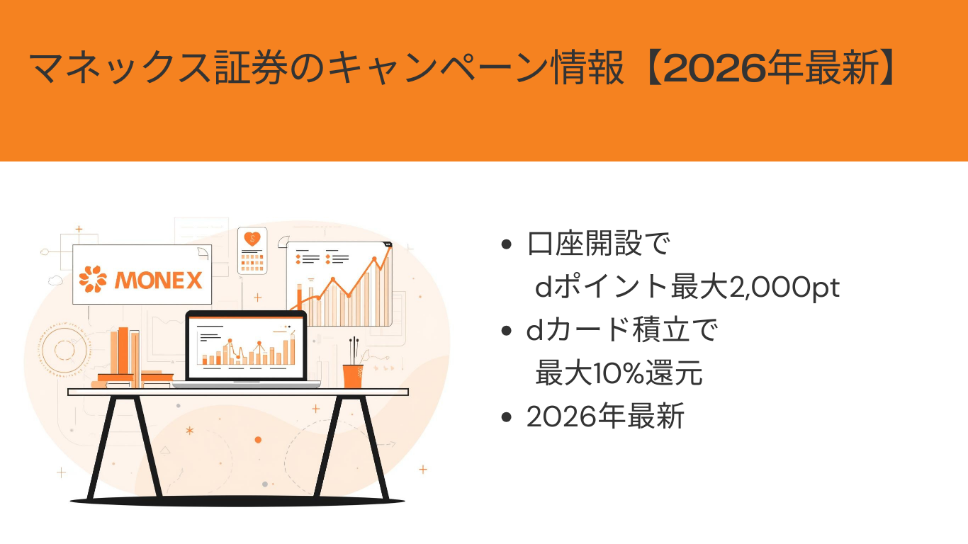 マネックス証券では、口座開設でdポイント最大2,000ptプレゼント、dカード積立で最大10%還元など、複数のキャンペーンを実施しています。